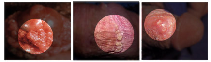 男性尖锐湿疣的症状:在生殖器温度较低而且干燥部位的损害常常表现为小而扁平状,而在温热,湿润部位者常呈丝状或乳突瘤状,初发时为少数微小淡红色丘疹,渐渐增大及增多,表面凹凸不平,湿润而柔软,呈大小不等的乳头状、鸡冠状、蘑菇状等,摹样或融合成大团块呈菜花样突起,红色或污灰色。