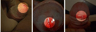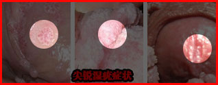 在阴茎包皮、冠状沟、包皮内侧、包皮系带、尿道口及阴茎部,有淡红色丘疹,可逐渐长大,形成凹凸不平的柔软乳头样病变,有分泌物浸渍可呈灰白色,污灰色或红色。