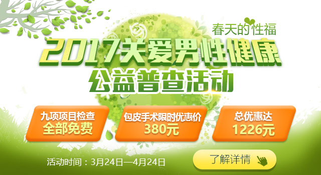 响应国家卫计委号召,针对关爱男性健康开展了独特的“公益普查先行”活动。即日起通过网络预约来院可享九项项目0元检查,包皮包茎手术费用380元,总优惠额达1226元!