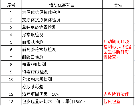 治疗费优惠20%:尿道炎、尖锐湿疣、生殖器疱疹、梅毒等。
