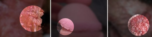 有淡红或污红色粟状大小赘生物,形态如丘疹状、乳头状、菜花状、鸡冠状,渐渐长大或增多。赘生物表面有颗粒、湿润或有出血,在颗粒间常集中有脓液,散发腐臭气味,搔抓后可继发化脓,也可出现生殖器潮湿、红斑伴有异味。