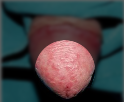 2、龟头长红色、深红色小颗粒:男性龟头出现单个或数个红色小颗粒,可为圆形、环形或不规则形,边界清晰,略高而硬。多见于包皮龟头炎,严重伴有糜烂、结痂或乳头样增生;如伴有破溃、脓疱或浆液性分泌物等症状,多提示患有梅毒。